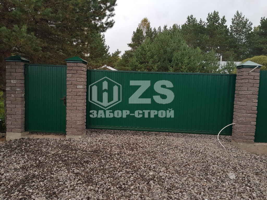 - Забор с кирпичными столбами из профнастила 8 соток